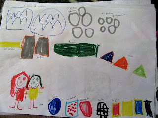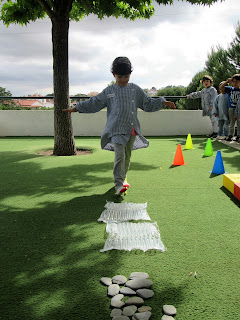 o percurso estava preparado...tirámos os sapatos...e sentimos diferentes materiais: gravilha, pedras lisas e seixos da praia, plástico às ondas, almofadas fofas, fundo de caixote de fruta, esfregão verde, cordas, cartão, mas desta vez com os pés...