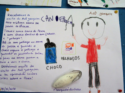O avô é um grande pescador e pedimos-lhe que nos ensinasse coisas sobre a pesca, e assim foi...trazia uma cana de pesca, uma caixinha com uma espécie de anzois mas que para apanhar choco, se chamam "palhaços" e para surpresa de todos um choco que tinha pescado.