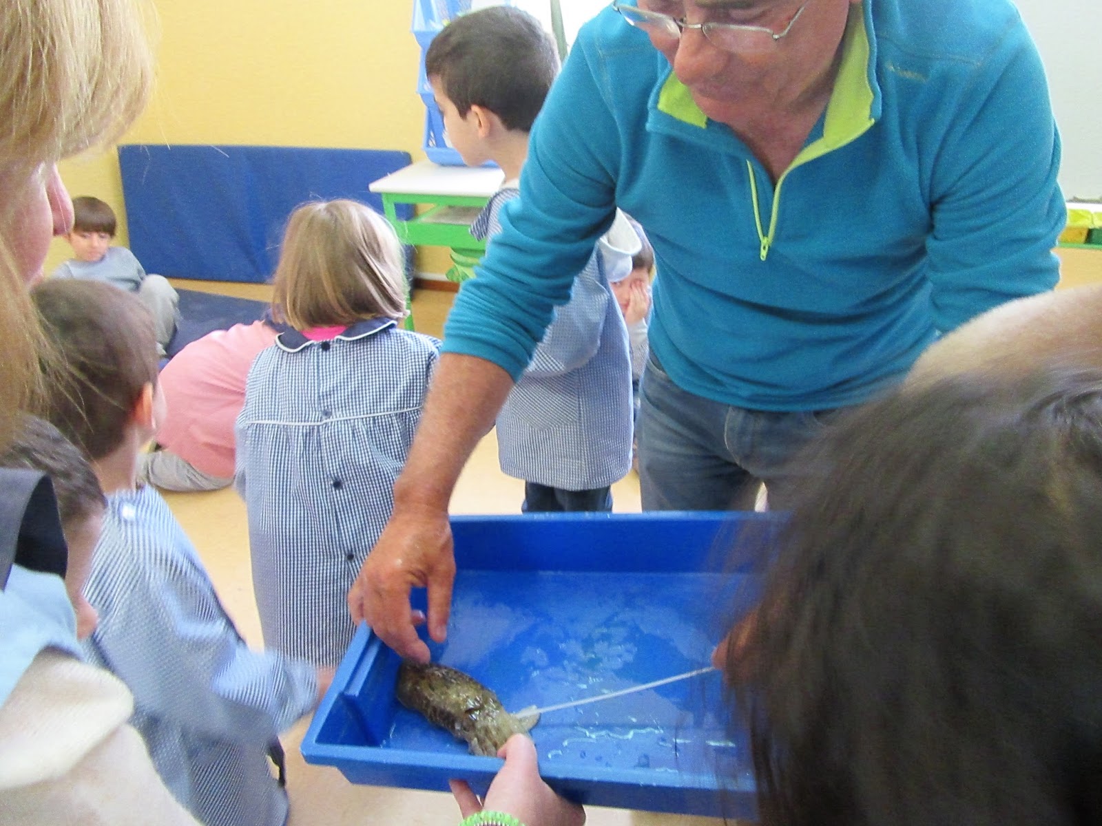 O Sr. Joaquim ensinou-nos muitas coisas...o nome dos instrumentos da pesca ...cana de pesca, carreto, fio de pesca, chumbada e os tais palhaços "mascaras de camarões" segundo a Matilde, e que servem para enganar os chocos. Estes para se defenderem dos "predadores" por exemplo os golfinhos, como muito bem disse o Miguel, deitam uma tinta preta, o "ferrado".
