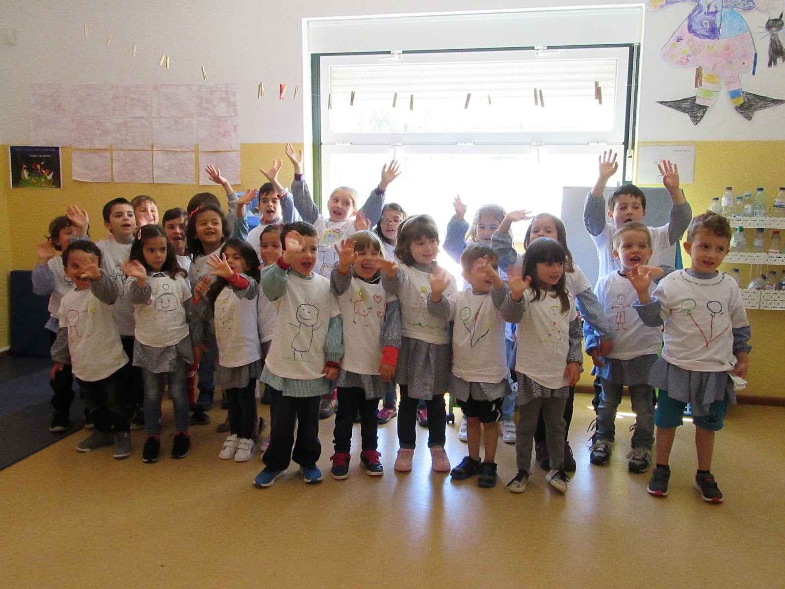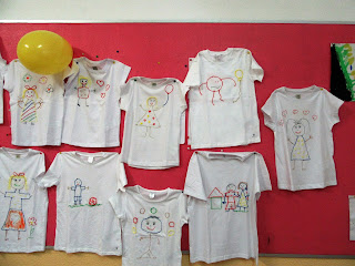 Foi um dia diferente o de ontem, na escola festejamos o Dia da Criança ontem uma vez que o dia 1 de junho é feriado do Concelho. A surpresa para os meninos foi uma t-shirt pintada em que o desenho era da autoria de cada um deles...depois de expostas, foi-lhes proposto que reconhecessem  sua t-shirt através do seu desenho...não foi difícil descobrir "o registo" como dizia o Tiago.