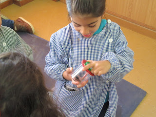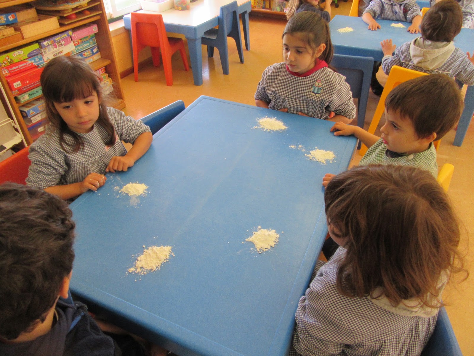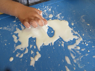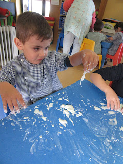 A seguir pusemos a mão na massa lieralmente...a massa mágica feita com farinha maizena e água fizeram as delícias dos cientistas que descobriram as várias texturas desta massa ora líquida ora sólida...